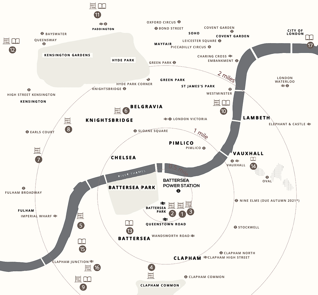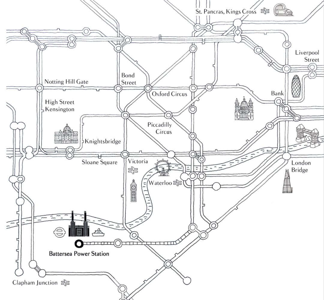 项目门口的地铁站有Battersea Power Station,还有两个地上铁车站Queenstown Road和Battersea Park,可以轻易到达伦敦的任何角落。从Queenstown Road火车站出发可到达汇聚着地铁Jubilee线,Northern线,Bakerloo线,Waterloo & City线以及国家铁路的Waterloo站。