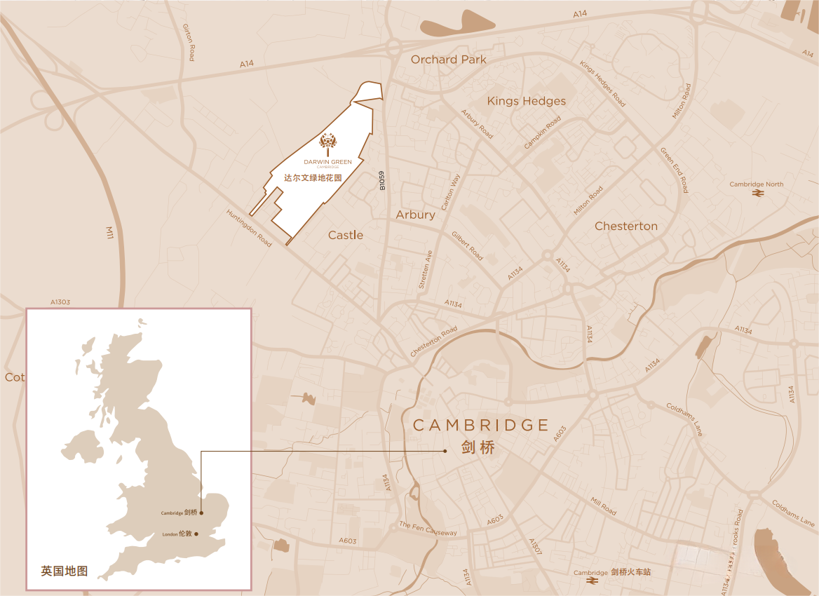 达尔文绿地花园坐落于剑桥大学城以西北处。在这个生机勃勃的新社区里,公共区域树荫环绕,现代气息之中尽显剑桥的葱郁绿意。在这里,您不仅可以流连于各式的商店、活动与食肆,还可以探索剑桥老城里令人难忘的建筑、铺满鹅卵石的小道、景色优美的公园与名的康河。
