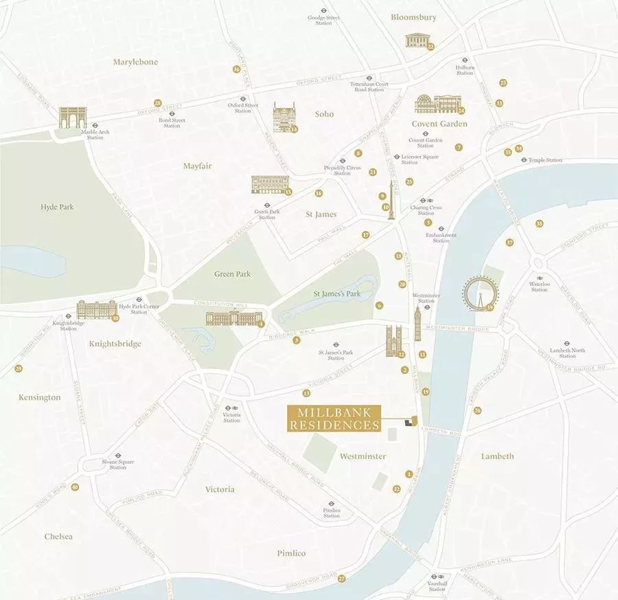 9 Millbank坐落在英伦地标林立的历史名区威斯敏斯特这里有女王府邸白金汉宫、大本钟、威廉王子婚礼,举力地和唐宁街10号。漫步于岁月印记间,亦能过一种现代摩登的都市生活。项目周边分布着琳琅满目的精品店Library Bar at The Ned酒吧,以及其林餐厅The Goring等,优质的商业空间丰富着居民的日常活动。生活半径内丰富的泰特美术馆、萨奇美术馆、大英博物馆等,则为徜徉于艺术海洋的闲暇时光提供着便捷。9 Milbank毗邻众多高端购物区,Harrods哈罗德百货、Selfridges塞尔福里奇百货公司,以及伦敦知名购物街牛津街,充实着人们的购物体验。
