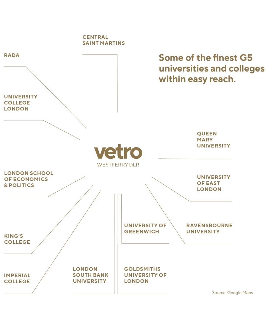 项目便捷的交通出行,于此乘坐DLR轻轨,可快捷前往伦敦多所知名学院。包括伦敦玛丽女王大学,东伦敦大学,伦敦国王学院,格林尼治大学,伦敦大学学院,伦敦政治经济学院等。