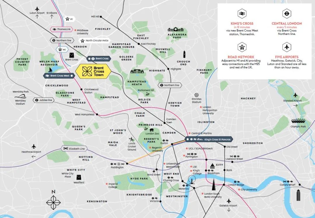 布伦特十字镇(Brent Cross Town)便捷的交通,让居民短时间内即可直达国王十字,更可搭乘欧洲之星,快速抵达欧洲城市旅游。