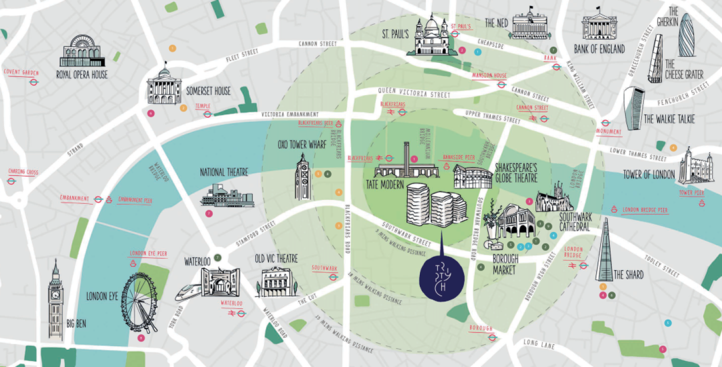 Triptych Bankside地处南岸文化区。伦敦SE1区,距离泰特现代美术馆、莎士比亚环球剧场仅几步之遥,可以轻松步行至千禧桥、伦敦眼、博罗市场,汇集了绿地、街头艺人、涂鸦区等诸多元素,居民走在泰晤士河岸,可享受伦敦悠闲的生活与浓郁的艺术氛围。