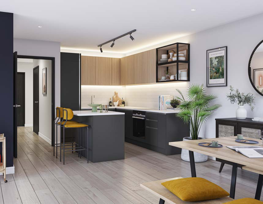 现代化的厨房设有时尚的石墨和木纹橱柜,并搭载集成的西门子电器。