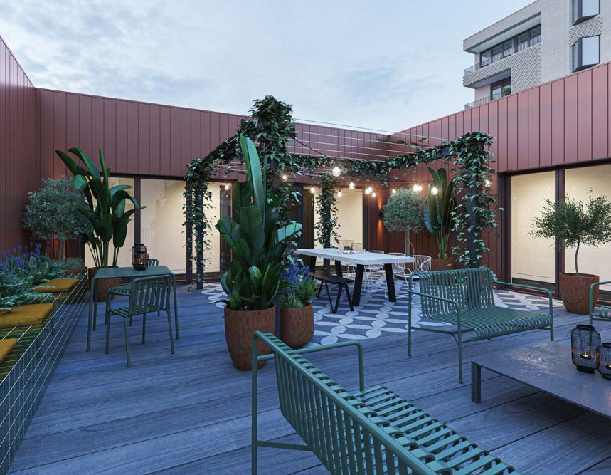 公共屋顶露台的设计旨在鼓励居民社交与户外生活的体验。