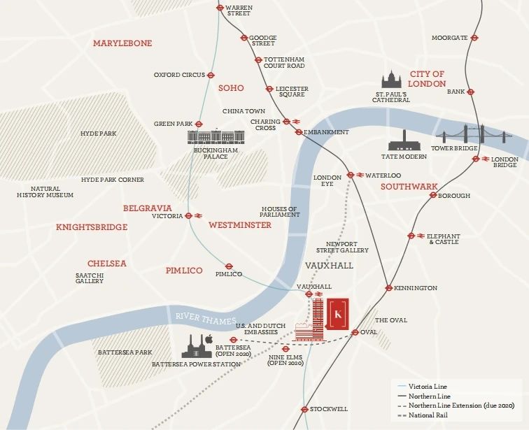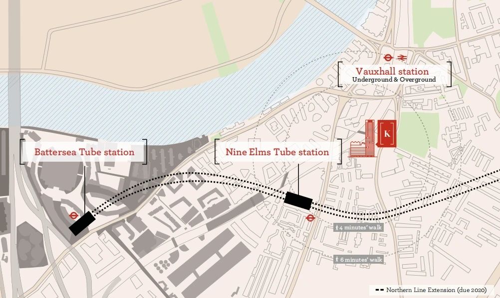 从项目出发,步行便可到达北线的九榆树站 Nine Elms,Northern line。乘坐该线还能到 Vauxhall 站,在这里能换另一条地铁线, 维多利亚线 Victoria line。