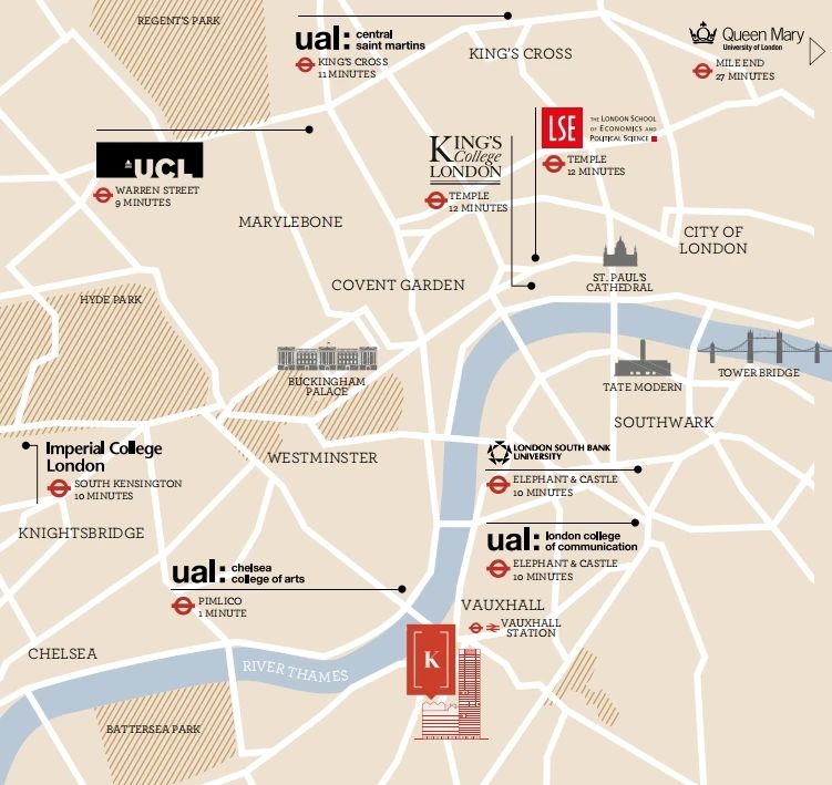 Keybridge步行可达Vauxhall站,Vaushall车站拥有完善的交通网络,从这里出发可以轻松到达各大高校。