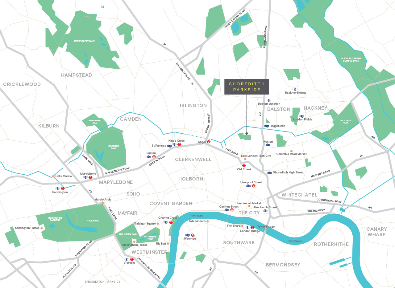 Shoreditch Parkside 位于伦敦东一区,毗邻「伦敦硅谷」东伦敦科技城,步行可达Haggerston地铁站,坐拥风景如画的摄政运河河景。