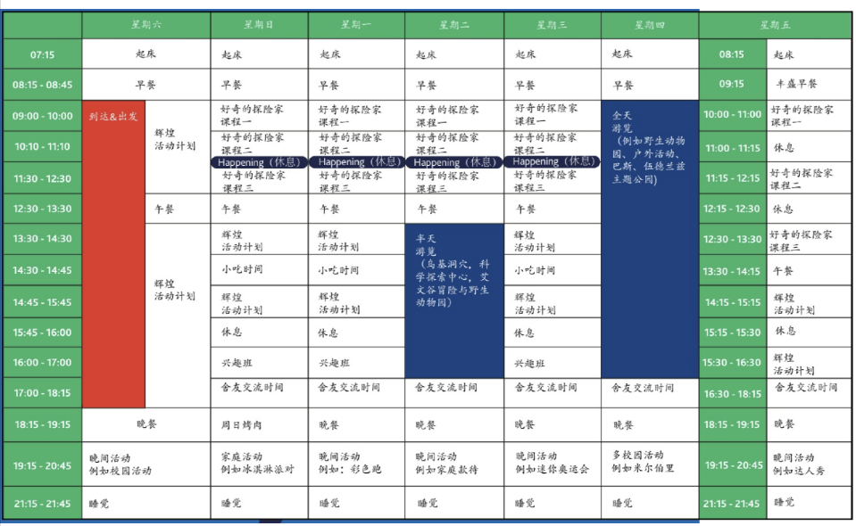 - 每周学生将享受一次全天和一次半天的旅游,融合了运动、历史、娱乐、体验和教育性质的旅游。