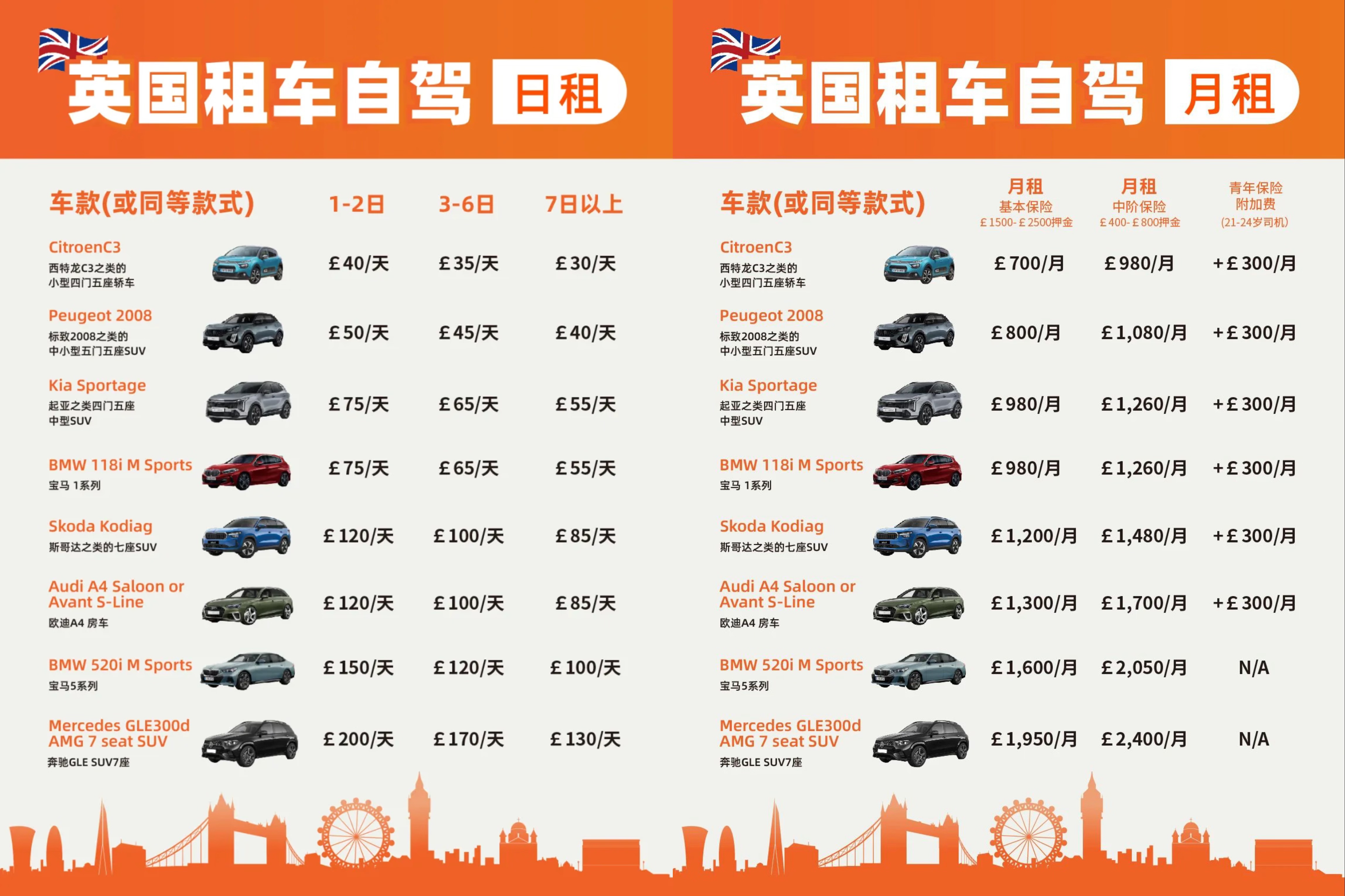 2.押金区间 £1,500–£2,500(视车型),青年司机(21–24岁)需额外保险加费。
