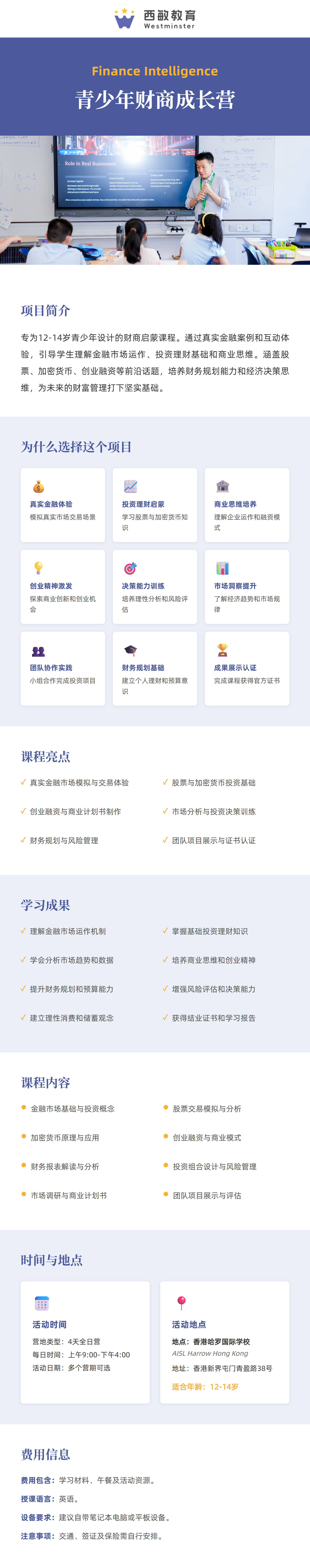 适合9-11岁学生,剑桥英语A2Key备考与中学入学面试营,结合英国文化教育协会专业教学,系统提升英语听说读写能力,同时针对性训练中学入学面试技巧。全程英语授课,助力学生顺利通过考试和面试。5天日营